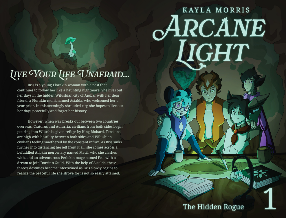 While working on Arcane Light, I had the opportunity to meet a local graphic novelist named Ray Coffman at a small convention, where I got to ask questions about his process. One thing that stuck with me was that he didn’t feel his story was his until he connected it to events that happened in his life. I began to realize that each character reflected different parts of me and even certain plot threads I had planned held experiences from my life. Even the places showcased carry inspiration from memorable places that I’ve been to. Coffman’s words were an insightful reminder of why I love storytelling so much; no one else will be able to tell my story the way I can.