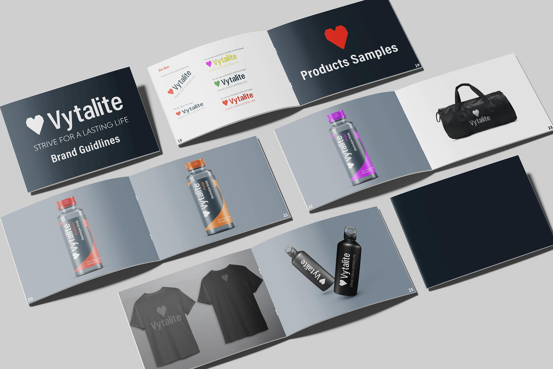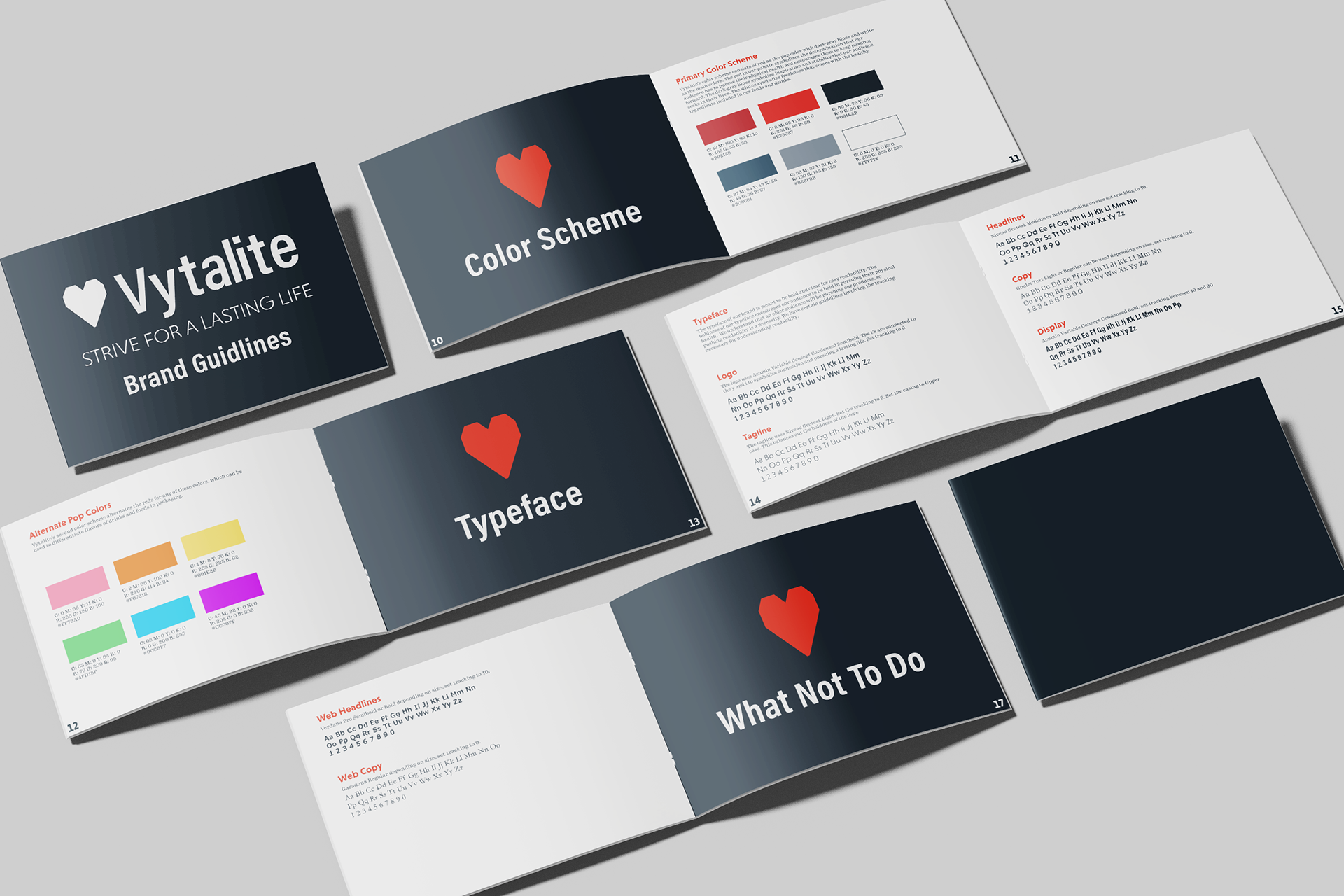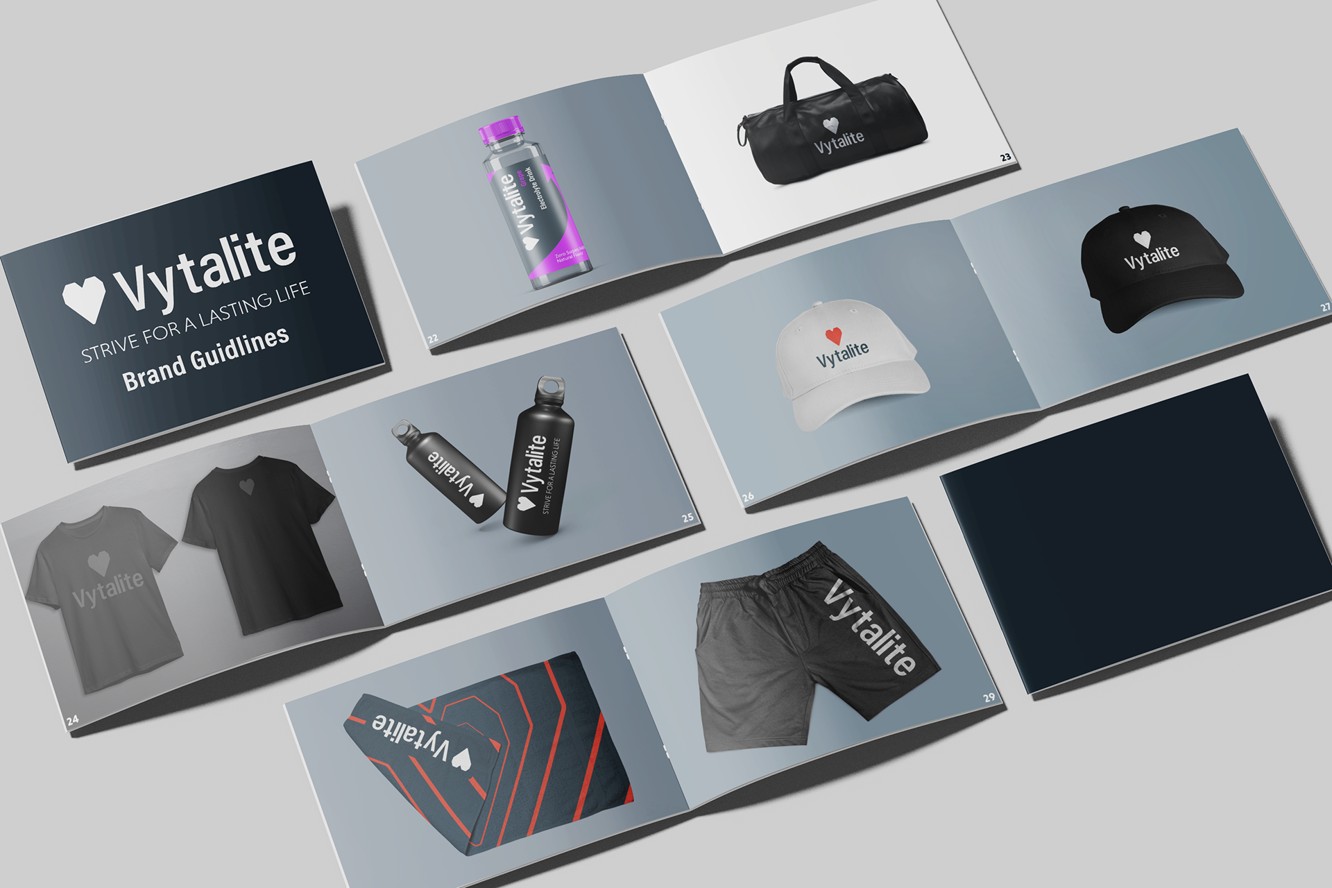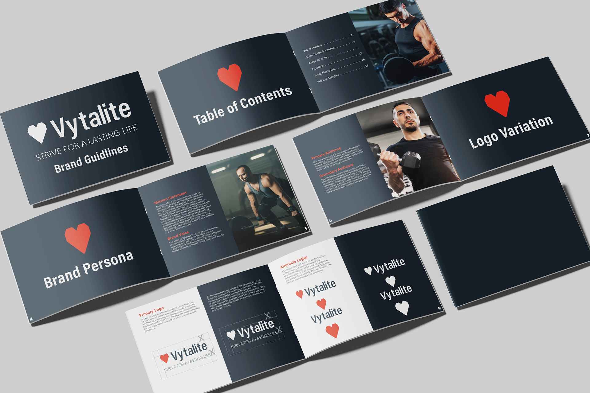 Vytalite is a brand of electrolyte drinks and foods dedicated to encouraging the physical health of their main audience in older men, but also hope to reach older women and younger audiences as well. The brand book showcases what can be done with the logo as well as packaging variation. Vytalite's main product is their natural flavored fruit drinks, but has expanded to water bottles, clothes, towels and much more.